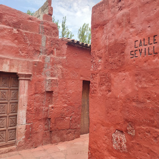 Après le petit-déjeuner, nous attaquons le riche programme de la journée, en commençant par la visite du monasterio de Santa Catalina. Une guide francophone nous propose ses services, que nous acceptons. Le plus grand couvent du monde vaut bien quelques "soles" de plus, afin de mieux comprendre son histoire ! L'entrée est un peu chère, mais apparemment le visiteur en a pour son argent. Ce couvent a été fondé en 1579 par une riche veuve d'Arequipa. Notre guide nous explique, en s'adressant à Alicia, que c'étaient les deuxièmes filles des grandes familles espagnoles qui entraient au couvent, en échange d'une dot assez importante. Le couvent s'est développé avec le temps et est devenu "une ville dans la ville". Une fois entrées au couvent, les religieuses n'avaient plus le droit de sortir. En revanche, leurs servantes (car oui, les religieuses de l'aristocratie espagnole avaient le droit d'être accompagnées toute leur vie par une servante) sortaient chaque semaine pour s'approvisionner en aliments au marché et pour apporter les nouvelles du monde extérieur et les commérages.