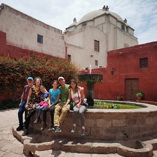 Nous visitons également un endroit inédit : le Mundo Alpaca. Il s'agit d'une sorte de ferme pédagogique avec quelques alpagas et lamas dans un enclos, des expositions sur les laines et les processus de transformation et de tissage. Nous arpentons les rues du quartier San Lazaro, le plus ancien quartier d'Arequipa où se sont installés les premiers conquistadors, nous passons devant les monuments majeurs du centre historique (certains bien cachés que nous n'aurons pas découverts tout seuls) et nous réalisons aussi deux dégustations en chemin: une de chocolat bio et une de chicha (alcool à base de maïs fermenté). Le tour se termine peu avant 18h sur le toit d'un édifice sur la Plaza de Armas et qui est aujourd'hui transformé en restaurant-bar. Ici, nous avons une belle vue panoramique sur la place et sur les bâtiments qui l'entourent, à quelques minutes du coucher du soleil. Nous sommes très satisfaits de la visite qui a été un peu longue pour les filles, d'autant plus qu'elles ne comprenaient pas le guide qui parlait anglais, mais très passionnante pour nous.