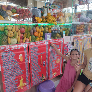Nous montons cette fois-ci dans deux taxis et nous retournons à l'hôtel pour déposer les bagages, avant d'aller manger dans un restaurant végétarien qui propose de bons menus du jour. Nous passons le reste de l'après-midi au mercado San Camilo pour acheter les ingrédients pour le repas du soir. Pour l'anecdote, le marché a été dessiné par Gustave Eiffel. L'avait-il imaginé si coloré et si animé ? Nous nous promenons une deuxième fois dans cet univers rempli des produits locaux et nous goûtons encore au délicieux jus de fruits mangue-orange et maracuya-orange. Une fois les produits dans les sacs, nous rentrons à l'hôtel tout en marquant des petits arrêts devant quelques monuments et quelques magasins. Les filles préparent quelques petits sacs à distribuer aux personnes dans le besoin et les adultes préparent l'apéro. Au menu: un cocktail à base de pisco avec fromage et saucisson, ça fait 4 mois que nous en rêvons ! Alicia termine son camembert en deux-deux et les petits chocolats Kinder y passent aussi dans la soirée. Nous fêtons encore une fois les retrouvailles et validons le programme pour le lendemain.