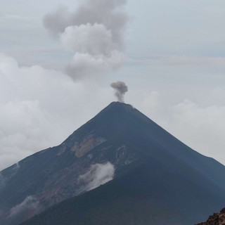 Après ce repas rapide et sommaire, nous repartons de plus belles. Nous sommes désormais sortis des zones boisées, signe que le sommet n'est plus si loin que ça. L'objectif du jour est de rejoindre le camp, le sommet sera uniquement pour les courageux qui partiront à l'aube demain matin. Tout à coup, après une courbe, le voilà, nous apercevons le volcan El Fuego, juste en face... Et quoi de mieux comme accueil qu'une éruption ! Il se met à cracher de la fumée noire et des projections de roches volcaniques, puis à gronder d'un bruit assourdissant... Le premier sentiment est incroyable, je ne pensais pas voir ce spectacle de mon vivant. Sincèrement, je pouvais déjà faire demi-tour tellement j'étais satisfait de ce que j'ai vu. Mais bon, comme on est là, autant en profiter jusqu'au bout. Surtout qu'il a pour réputation d'entrer en éruption toutes les 20 minutes, de quoi nous occuper les prochaines 18 heures.