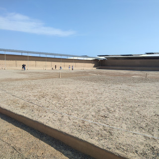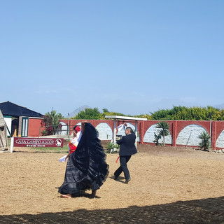 De retour dans le minibus, d'autres personnes se joignent à notre groupe et notre chauffeur-guide nous dépose devant un restaurant dans le village Moche. Le village regorge de statues, sculptures et autres reproductions artistiques des éléments de la culture Moche, retrouvés sur le site Huaca de la Luna. Le restaurant dans lequel nous laisse le guide propose un menu très cher, alors nous décidons d'aller quelques pas plus loin et nous tombons sur la cuisine de 2 sœurs qui proposent des recettes locales pour 3 fois moins cher que le premier restaurant. Au début, nous sommes méfiants quant à l'hygiène de la cuisine, mais les plats sont délicieux, copieux et très bien présentés. À peine les assiettes terminées, nous sautons dans le minibus qui file vers la prochaine activité de la journée: un spectacle de chevaux "peruanos de paso" et de danse traditionnelle "la Marinera". Cette activité est une surprise pour les filles qui sont impressionnées par les chevaux et par l'élégante danse qui s'effectue pieds nus.