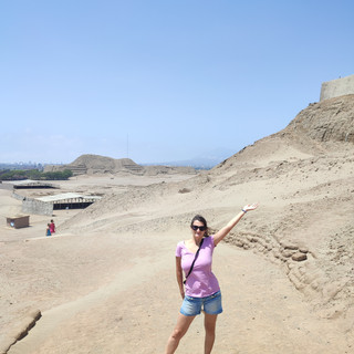 Au réveil, nous mangeons quelques fruits et des yaourts et partons direction Plaza de Armas d'où part notre minibus pour la journée. Notre chauffeur-guide est en retard, mais elle attrape vite le temps perdu en roulant à grande vitesse vers le premier objectif de la journée : la Huaca del Sol y de la Luna. L'endroit est assez original: il s'agit des pyramides en adobe construites par la civilisation Moche (ou Mochica) qui était contemporaine avec la civilisation Maya. Cette civilisation s'est développée sur toute la côte nord du Pérou actuel entre l'an 100 et 700. Je tombe sous le charme de cette découverte historique qui me surprend, tout comme la civilisation de Chavin, car j'associais tellement le Pérou aux Incas que je ne me suis jamais posé la question des autres civilisations précolombiennes. Je suis ravie d'absorber toutes ces nouvelles informations et d'en apprendre plus sur ces vestiges d'une autre époque. L'édifice de la Huaca del Sol représente un centre administratif qui n'a pas encore été exploité par les archéologues et qui ne se visite donc pas. L'autre pyramide, la Huaca de la Luna représente un centre religieux qui est étudié par les archéologues depuis quelques années et qui dévoile désormais ses secrets aux touristes. La construction impressionne par ses peintures murales qui se sont très bien conservés et qui représentent le plus puissant des dieux, Ai-Apaec, et d'autres créatures mythologiques, ainsi que des scènes représentant des cérémonies et des rituels religieux comprenant des sacrifices humains. Si les peintures murales sont si bien conservées, c'est parce que chaque étage de la pyramide était fermé et recouvert de terre tous les 80-100 ans, ce qui a permis de les garder à l'abri. D'après les tombes et les ossements retrouvés à chaque étage, on suppose également qu'à la mort de leurs chefs, les Moches les enterraient avec leur famille et serviteurs et fermaient l'étage comme pour clôturer un cycle de vie et construisaient par dessus un autre niveau. Les ossements des 40 guerriers sacrifiés ont également été retrouvés sur place. En effet, lors des cérémonies religieuses, les Moches organisaient des combats entre 2 guerriers et le perdant était sacrifié, son sang était censé calmer les dieux. Toutes ces représentations sont très bien conservées sur les murs de l'édifice. La visite du site est passionnante et le fait de bénéficier d'un guide nous permet de mieux comprendre la symbolique de cet endroit. C'est incroyable de se dire que cette construction qui ressemble à un tas de sable et de poussière vue de loin, peut cacher autant d'informations d'un point de vue historique. J'ai du mal à me décrocher du site quand le guide nous invite à rejoindre le minibus pour la suite du programme de la visite.