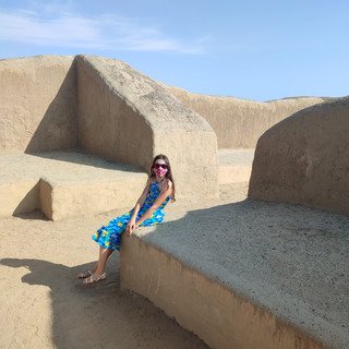 Les images de nos visites de la veille sont encore fraîches dans nos têtes quand nous partons pour cette deuxième journée de visite. Nous avons changé d'agence cette fois-ci et le minibus, très ponctuel, nous attend à 10h devant l'hôtel. Nous partons vers le nord de Trujillo à la découverte d'un autre site archéologique: le complexe el Brujo. Ce lieu se trouve plus loin que Chan Chan et Huaca de la Luna; nous avons environ 1h30 de route. Notre guide péruvien, qui s'appelle Napoleon, parle français et est une encyclopédie vivante. Nous ne nous ennuyons pas en sa présence. Dans le minibus, parmi les autres touristes, il y a un autre français. Nous sommes donc 5 à bénéficier des services privés de guide en français et cela permet aux filles de mieux comprendre l'histoire du lieu et de poser des questions. D'autant plus que la découverte réalisée sur le site il y a peu de temps les fascine: la momie de la dame de Cao, une jeune femme qui était sûrement une reine guerrière Mochica, est exposée à quelques mètres de là. Mais commençons par le début. Ce site archéologique, récemment découvert, est composé de 3 Huacas, dont une seule est explorée aujourd'hui. Le Pérou ne manque pas de sites archéologiques, il y a tant de vestiges historiques! Par contre, le pays manque d'argent pour financer toutes les fouilles. C'est pourquoi on nous explique que toutes les recherches archéologiques sont actuellement financées par des pays étrangers comme les États-Unis, le Japon, l'Italie ou la Suisse. Le complexe el Brujo appartenait également à la culture Moche et a été édifié comme à la Huaca de la Luna sur des étages superposés, construits tour à tour à la mort de chaque gouverneur, en forme de pyramide et sa fonction était cérémonielle. Après le déclin de la civilisation Moche, une autre culture (les Chimu) a repris les lieux et les a utilisés comme un cimetière. Une très grande quantité de squelettes a été découverte depuis cette époque, tout comme les squelettes des moines dominicains qui y ont construit une église après l'arrivée des Espagnols. Et en effet le lieu est effrayant : des restes d'ossements et de tissus nous entourent. Avec le vent et l'érosion, tout ressort à la surface. Les filles en observent à chaque pas et ça les impressionne. On comprend bien qu'on est dans un ancien cimetière: il y a des os humains partout! Nous avançons tranquillement, portés par les explications du guide. L'endroit et son histoire sont passionnants ! Après quelques minutes, nous arrivons enfin au lieu où la fameuse momie de la dame de Cao a été découverte. Ce lieu est ouvert au public depuis 2006 et le musée qui abrite sa momie, depuis 2009. Le corps momifié de la dame de Cao est recouvert de mystérieux tatouages très bien conservés sur ses bras. Il s'agirait d'une femme de 1,45 mètres de haut et âgée de 20 à 25 ans, couverte de 18 colliers, 30 ornements de nez en or et argent, des bandeaux de tête et des couronnes de cuivre doré. L'organisation de sa sépulture et les objets enterrés avec elle montrent qu'il s'agissait d'une dirigeante. Les filles se demandent, naturellement, pourquoi cette reine Mochica est morte à ce jeune âge. D'après les investigations scientifiques, elle serait morte après avoir donné naissance à son enfant, au vu des plis sur la peau de son ventre. L'histoire est passionnante et le guide nous invite à découvrir la momie dans le musée, ainsi que la reproduction 3D de la femme. Le temps s'arrête pendant cette visite.